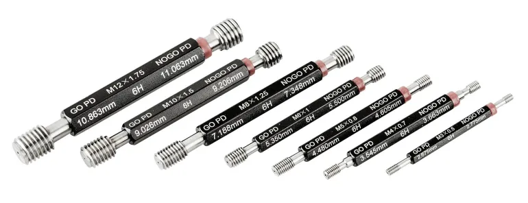 Seitsemänosainen kierretappitulkkisarja sisältäen koot M3, M4, M5, M6, M8, M10 ja M12. DIN13-standardin mukaisia. Toisessa päädyssä No-Go-puoli (hylky), toisessa GO-puoli (meno).
