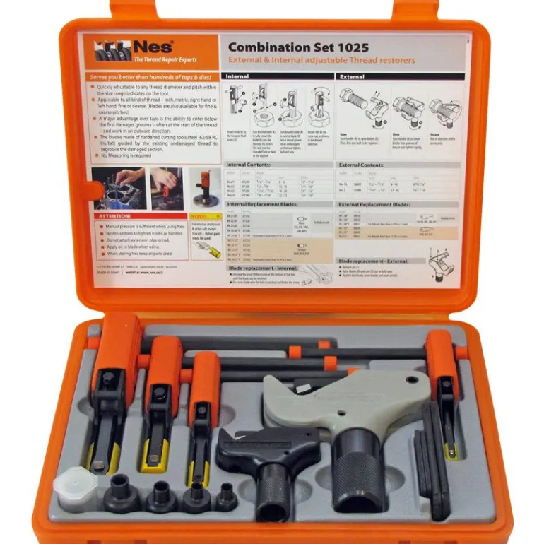 NES 1025 on kierteiden korjaussarja, jossa on kierteiden korjaustyökalu sekä sisäisten että ulkoisten kierteiden korjaamiseen. Toimitetaan kätevässä säilytyslaatikossa.