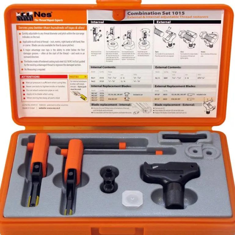 NES 1015 on kierteiden korjaussarja, jossa on kierteiden korjaustyökalu sekä sisäisten että ulkoisten kierteiden korjaamiseen. Toimitetaan kätevässä säilytyslaatikossa.