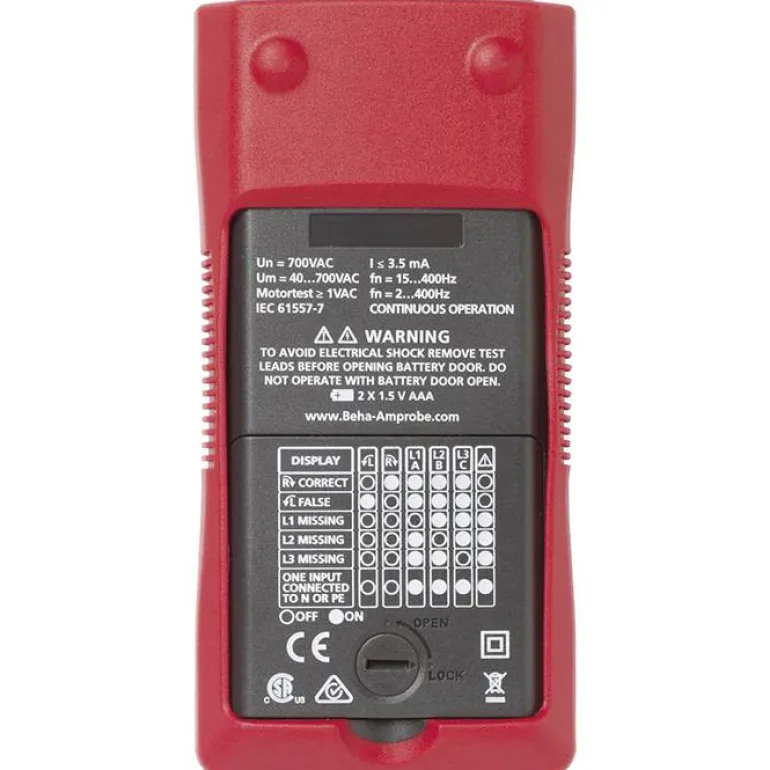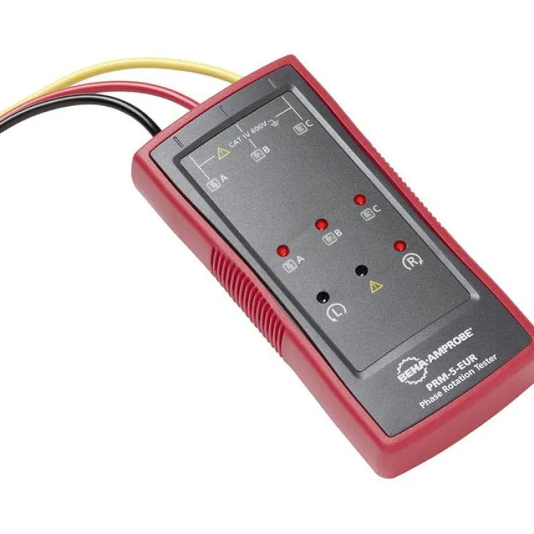 Beha-Amprobe PRM-5-EUR on kiertosuuntamittari moottorin kierroslukujen ja pyörimissuunnan tarkistamiseen enintään 700 V sähköjärjestelmissä. PRM-5 toimii ilman paristoja ja on luotettava mittari oikean kiertosuunnan tarkistamiseen kolmivaiheisissa johdoissa ja pistorasioissa.