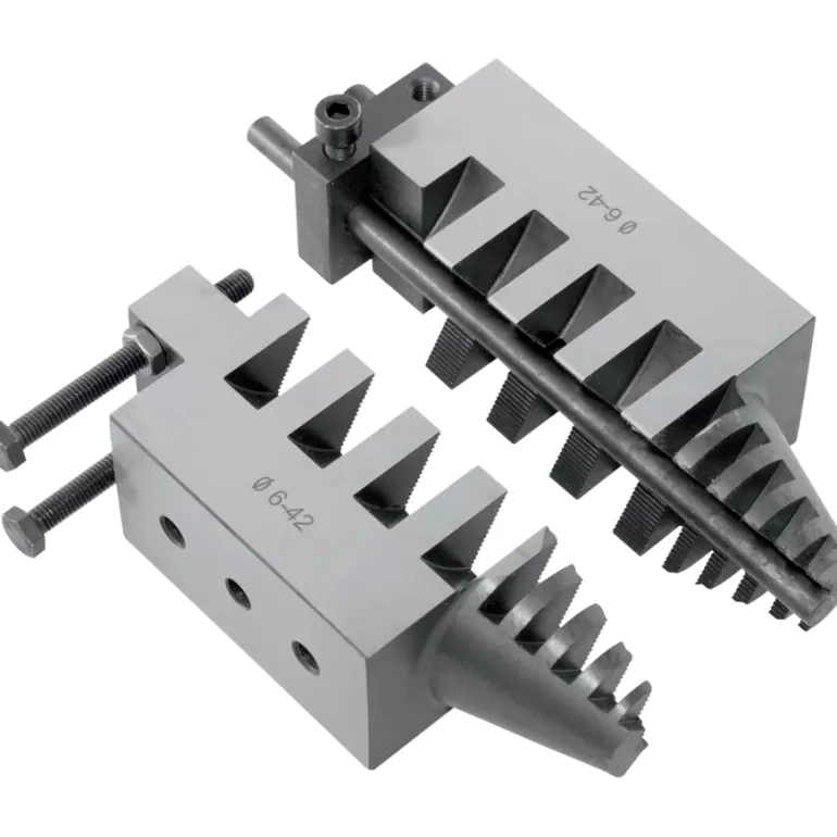 Erikoiskiristysleuat, pari, vedetyille materiaaleille, tappiruuveille, kuusioruuveille ja putkiyhteille. Työkalun pituus ennen kierteetöntä osaa vähintään 15 mm, Ø 6 – 42 mm. Sopii kierteityskoneeseen REMS Unimat 75.