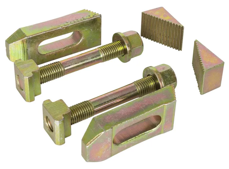 PELA 494744 on kiinnityssarja (T-ura mini/18 mm/M16). Sisältää 2 kpl kiinnityspultteja M16x125 mm, 2 kpl T-uramuttereita, 2 kpl laippamuttereita, 2 kpl 100 mm kiristysvarsia ja 2 kpl kiristyskiiloja.