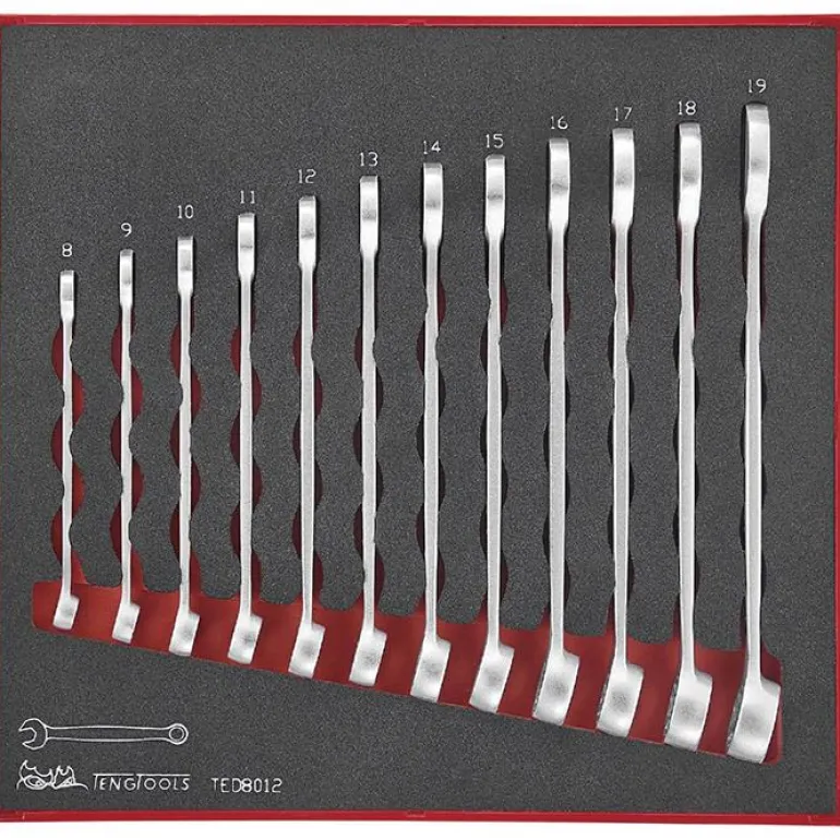 Teng Tools TED8012 on 12-osainen kiintolenkkiavainsarja kromivanadiiniterästä. Avoimessa päässä on liukueste ja ura, joka estää jakoavaimen luisumisen ja mutterin vaurioitumisen. Rengaspää on taivutettu 15 astetta ja upotettu paremman ulottuvuuden takaamiseksi.