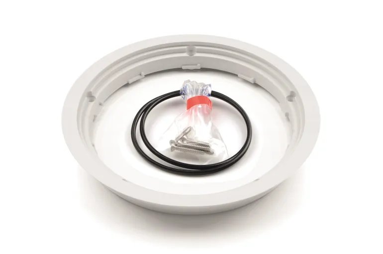 Jafo 7133854 on valkoisesta muovista valmistettu kiinnitysrengas, jossa on 5 haponkestävää ruostumatonta teräsruuvia ja O-rengas.