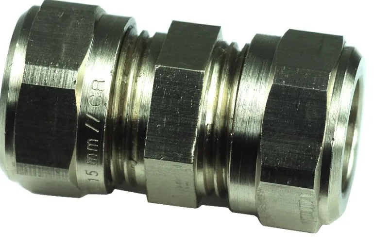 Suora kiristysrengasliitin tukiholkilla. Tehty messingistä, kromattu pintasuojaus