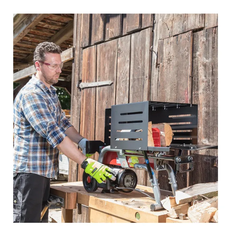 Teräsosat on jauhemaalattu ja siten hyvin ruostesuojattu. Vaakasuuntaisessa halkomakoneessa on 230 V:n moottori, jonka teho on 1,5 kW ja joka toimii luotettavasti. Halkomakone on kompakti ja tilaa säästävä. Vaikka halkomakoneessa on kahden käden turvaohjaus ja loukkaantumisriski on siten tavallista pienempi, suosittelemme käyttämään turvakenkiä, suojalaseja ja suojakäsineitä konetta käyttäessäsi. Varmista, että halkomakone on tukevalla, tasaisella, mahdollisimman hyvällä ja ergonomisella alustalla esim. työpöydällä.