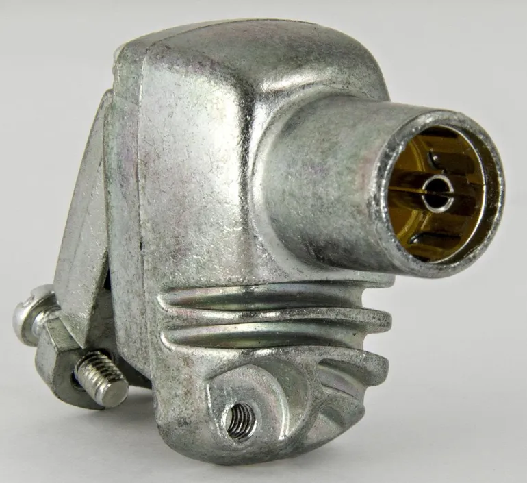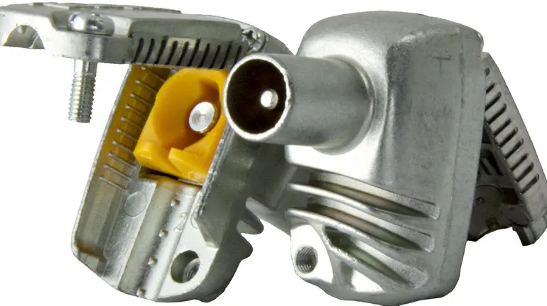 Koaksiaalinen kulmaliitin, luokka A+, IEC-naaras. Yleismallinen IEC-liitin Ø 5-7.5 mm tarjoaa erittäin korkean suojan Zamak-rakenteensa ansiosta, lisäksi ylimääräinen metallifolio. Impedanssi 75 Ω.