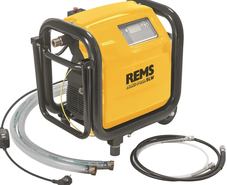 REMS Multi-Push SLW SETTI on tehokas, kompakti, elektroninen 1500W:n koeponnistusyksikkö öljyttömällä kompressorilla. Putkistojen huuhteluun vedellä tai veden ja ilman seoksella, desinfiointiin, puhdistukseen, konservointiin. Putkistojen ja säiliöiden painetestaukseen paineilmalla tai vedellä, esim. juomavesiasennukset, jäähdytin- ja pintalämmitysjärjestelmät, kaasulaitteistojen painetestaus paineilmalla. Paineilmapumppuna kaikenlaisten säiliöiden valvottuun täyttämiseen paineilmalla, esimerkiksi paisuntasäiliöiden tai renkaiden pumppaamiseen, sekä paineilmatyökalujen käyttöön.