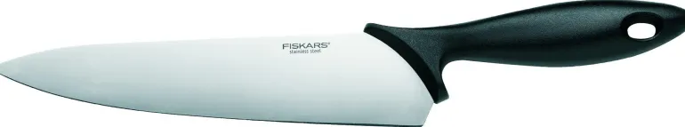 Perinteinen Fiskars Essential -kokinveitsi leveällä terällä, joka sopii vihannesten ja lihan leikkaamiseen. Konepesunkestävä.
