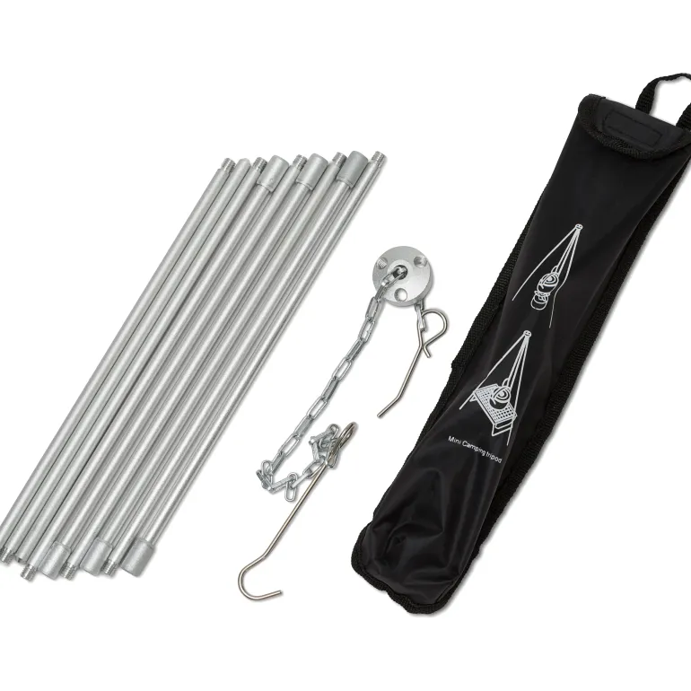 Alumiininen jalusta, jonka ketjun avulla voit säätää kypsennyskorkeutta. Tulijalustan kolme jalkaa seisovat tukevasti levitettynä ja siinä on koukku keskellä. Säilytetään suljetussa kestävässä polyesteri-säilytyspussissa.