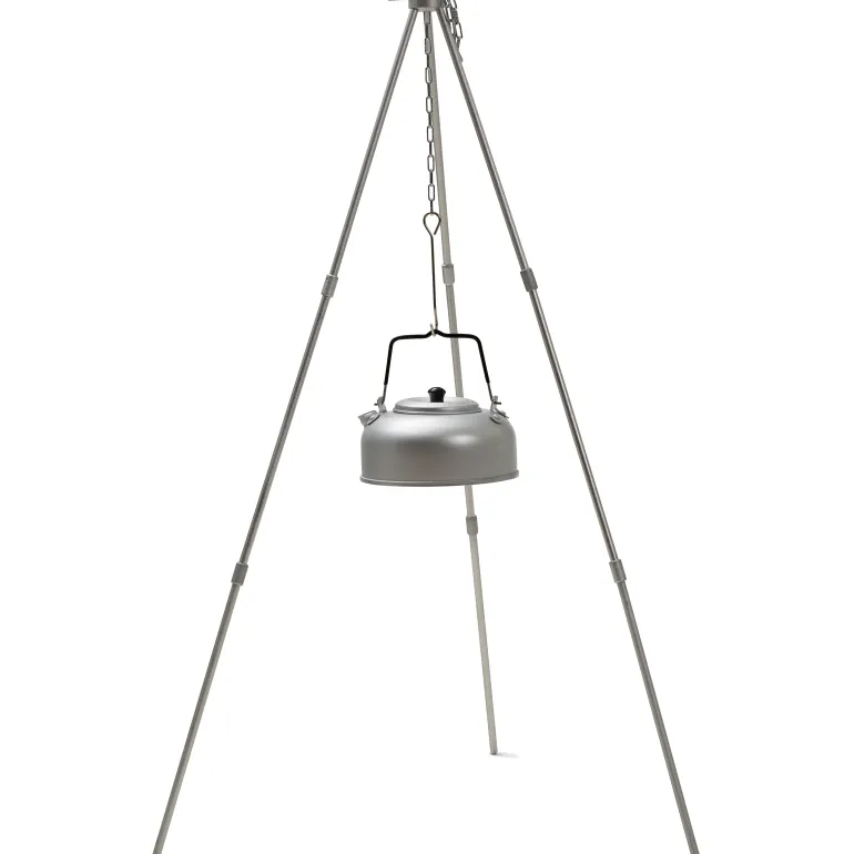 Alumiininen jalusta, jonka ketjun avulla voit säätää kypsennyskorkeutta. Tulijalustan kolme jalkaa seisovat tukevasti levitettynä ja siinä on koukku keskellä.