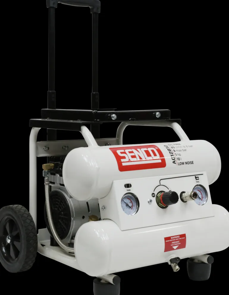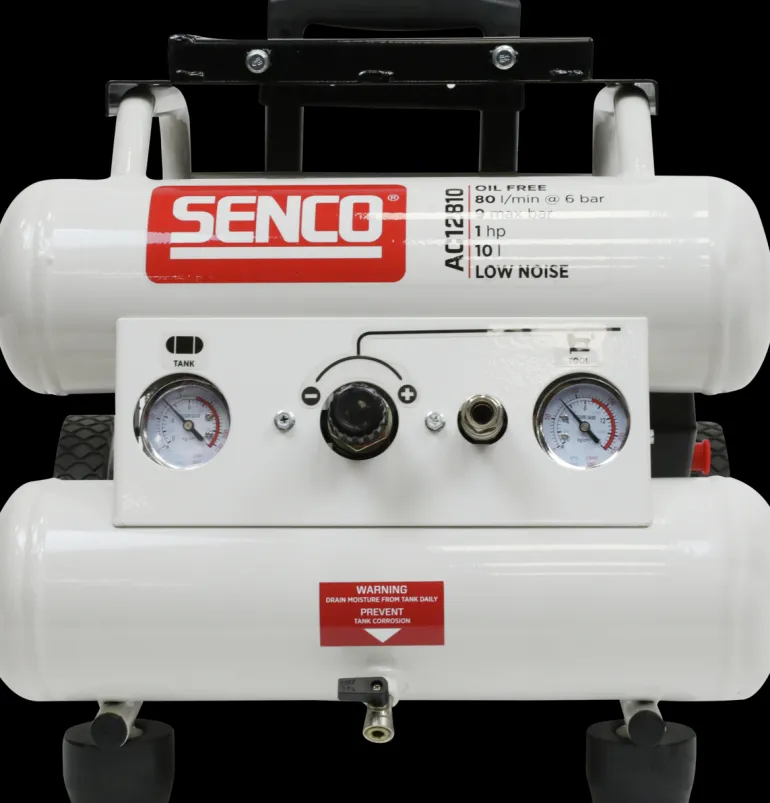 Aerfast AC12810 on kompakti, siirrettävä öljytön low noise -kompressori, jonka melutaso on vain 65 dB ja työpaine 7–9 baria.