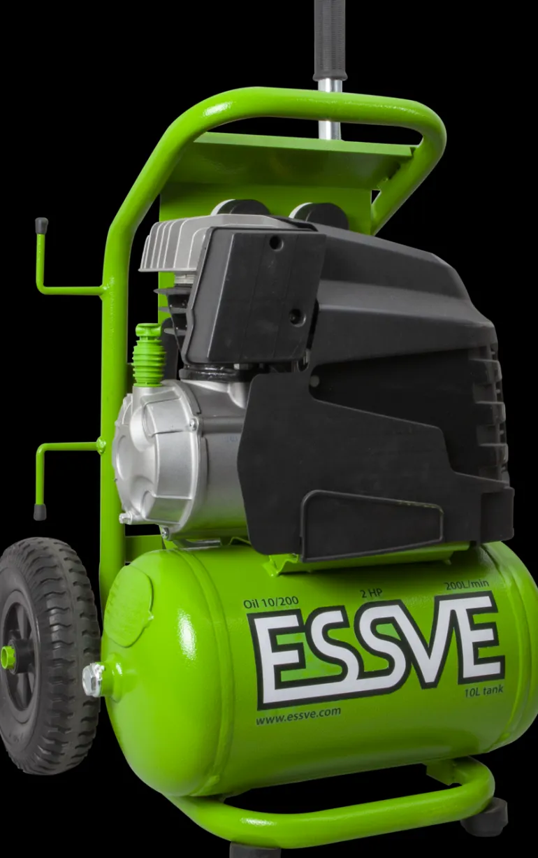 ESSVE OIL 10/200 on kestävä öljyvoideltu kompressori, jossa on kunnolliset pyörät ja vetokahva sekä manometri säiliöpainetta ja paineensäätimen letkuliitännän haluttua lähtöpainetta varten. OIL 10/200 soveltuu dyckertnauloille, hakasille sekä keskikokoisille naulaimille, esim. kattohuopanaulaimille.