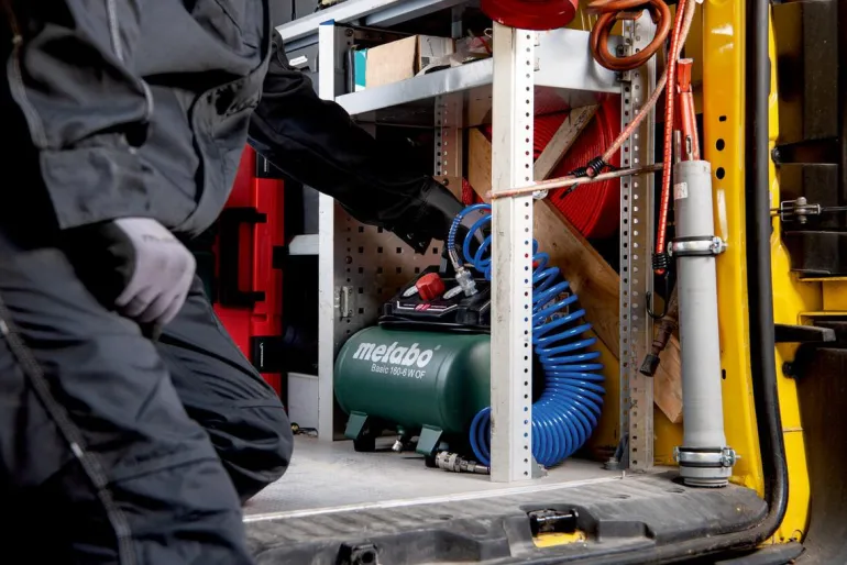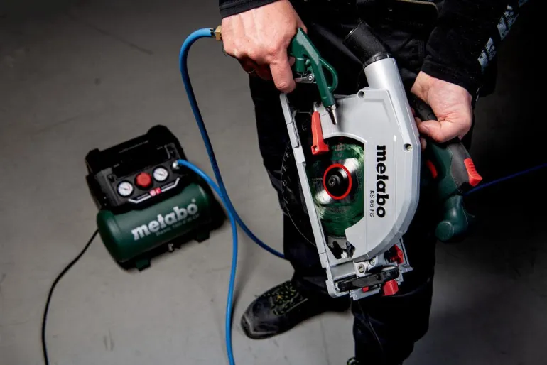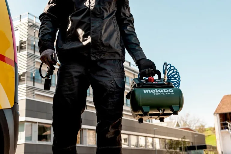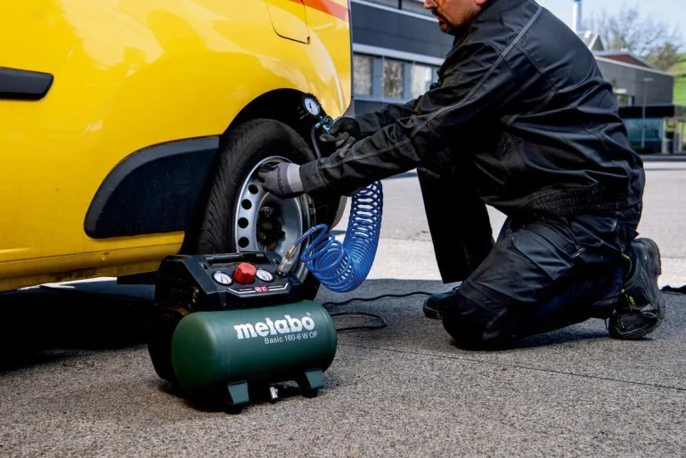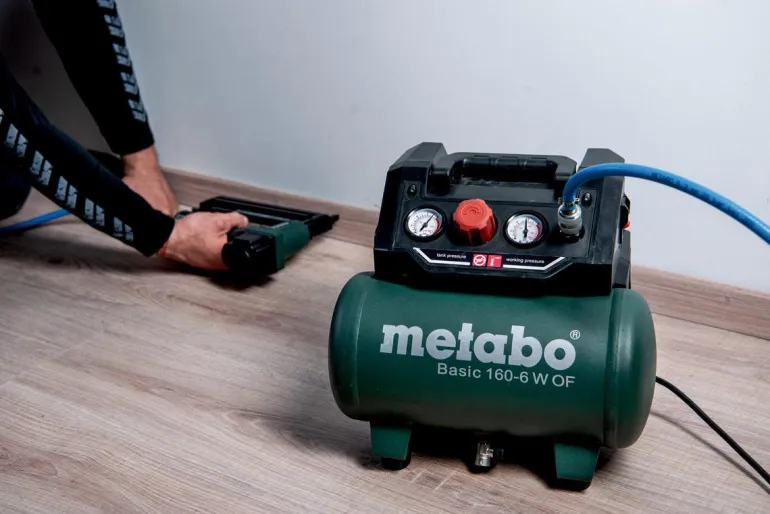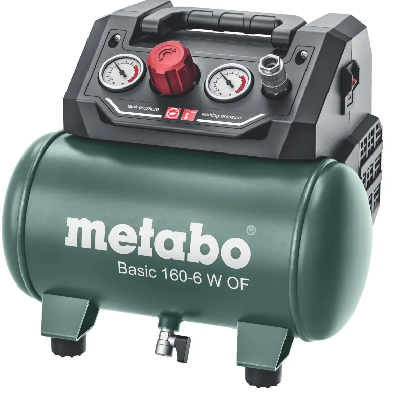 Metabo Basic 160-6 W OF on kätevä 6-litrainen kompressori tehokkaalla moottorilla yleiskäyttöön. Soveltuu niittaukseen, naulaamiseen, puhaltamiseen, renkaiden pumppaamiseen sekä käyttöön patruunaruiskujen, rasvapistoolien ja niittipihtien kanssa. Tätä öljytöntä mäntäkompressoria on helppo kuljettaa ja tilaa säästävä säilytys on helppoa taitettavan kahvan ja kompaktin rakenteen ansiosta. Näyttöpaneelissa on selkeät painemittarit säiliölle ja käyttöpaineelle. Säädettävä, mukautettu käyttöpaine painemittarilla varustetun paineenrajoittimen ansiosta. Ylikuormitussuoja suojaa moottoria ylikuumenemiselta ja kumitetut jalat tarjoavat hyvän vakauden myös kuljetuksen aikana. Basic 160-6 W OF on myös varustettu siipikahvallisella palloventtiilillä kondensaattin kätevää tyhjentämistä varten. Painesäiliöllä on 10 vuoden takuu läpiruostumista vastaan. Mukana yleiskäyttöinen pikaliitin.