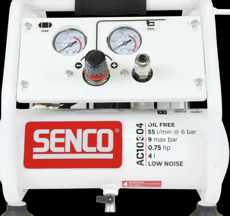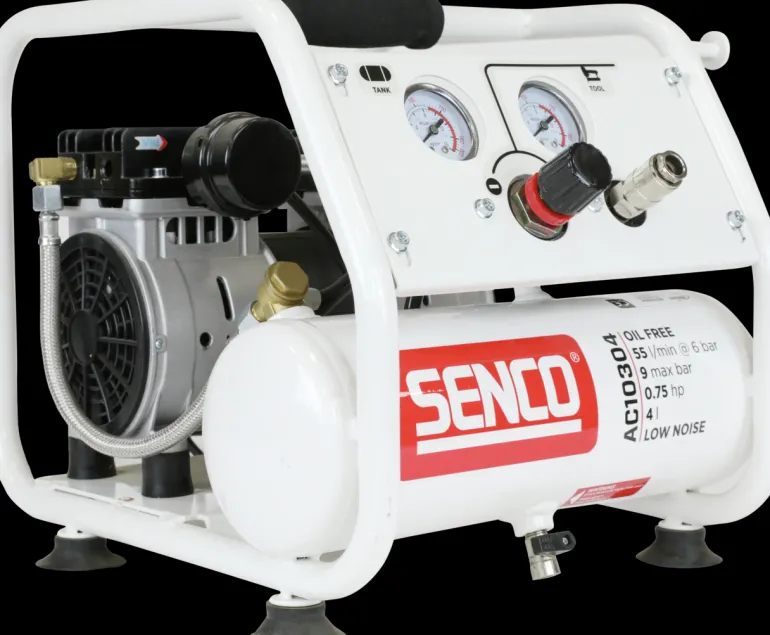 Hiljainen kompressori, joka soveltuu käytettäväksi dyckert-naulainten ja hakasnaulainten kanssa. Kompakti, kannettava ja hiljainen – vain 60 dB. Kompressorin työpaine on enintään 9 bar ja se tuottaa jopa 103 l minuutissa.