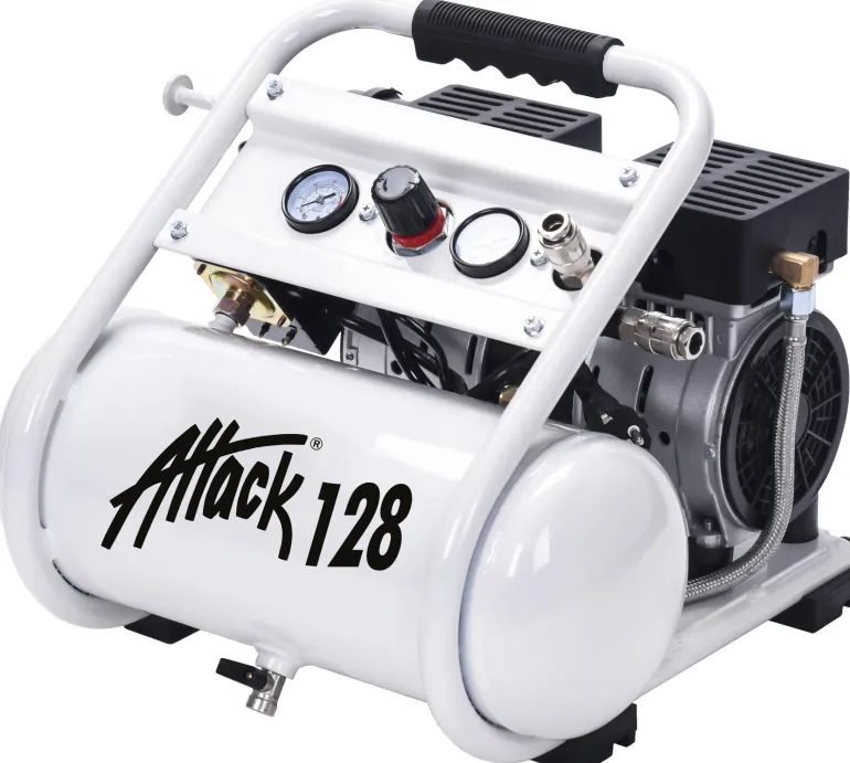 Attack 128 on kompressori, jossa on integroitu ohjauspaneeli ja paineensäätöventtiili. Ergonominen ja tukeva kantokahva. 2 pikaliitintä. Vankat kumijalat ja harjaton moottori. Öljytön ja vähäinen huoltotarve.
