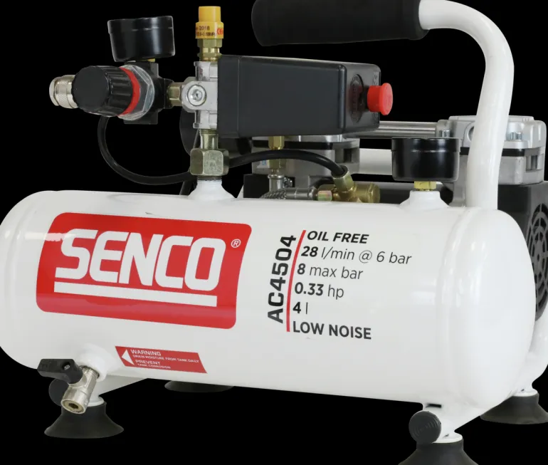 SENCO AC4504 on kompakti ja kannettava kompressori pienille naulaimille. Voimakas ja erittäin hiljainen (58 dB) matalilla kierroksilla toimiva moottori, joka tuottaa 8 baarin työpaineen. Jopa 45 l/min.