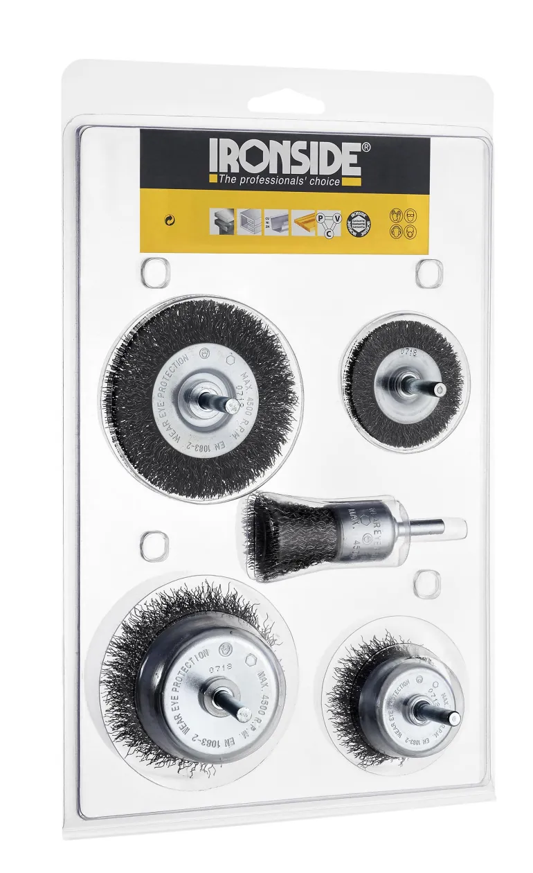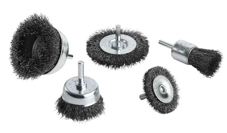 Koneharjasarja, jossa pyöröharja D50mm ja D75mm, päätyharja D25mm, aksiaaliharja D50mm ja D75mm, aallotettu teräslanka 0,30mm, varsi D 6mm.