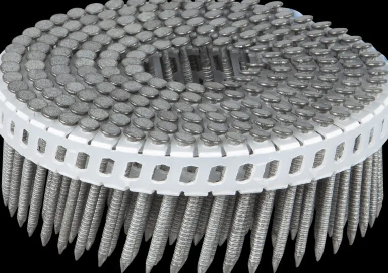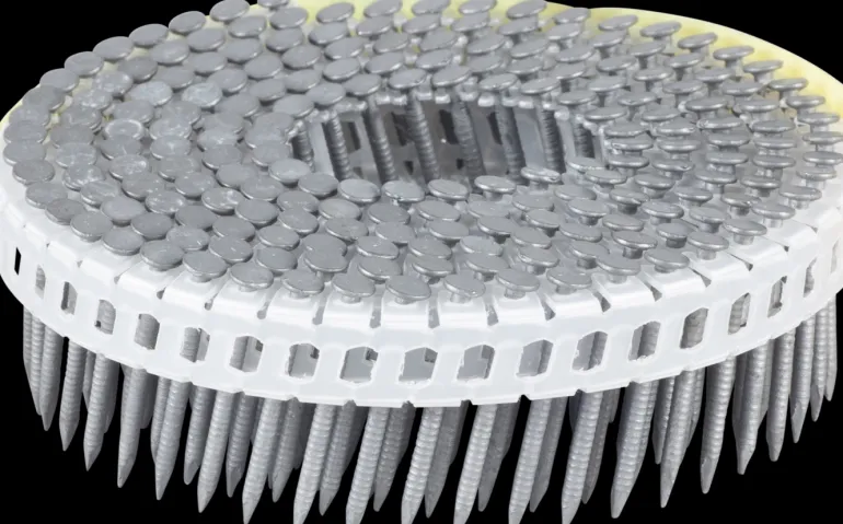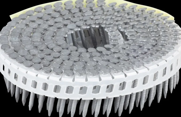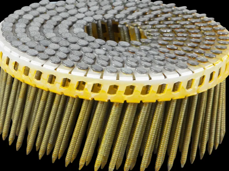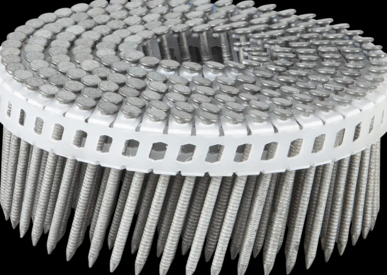 Muovinauhoitettu konenaula, 15°, kuumasinkitty. Sopii kaikkiin perustyökaluihin, jotka käyttävät 15°:n muovinauhoitettuja nauloja.