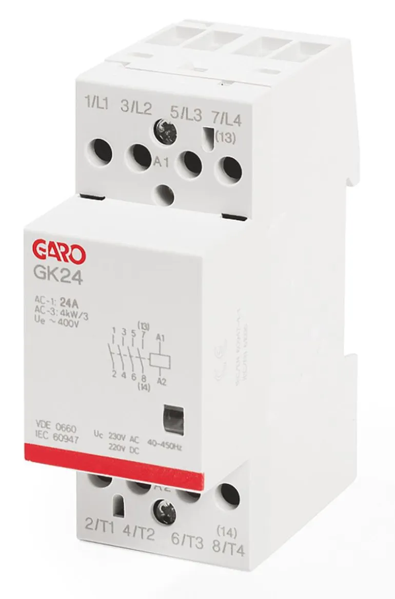 4-napaiset kontaktorit 24–63 A, joissa on erilaiset kelajännitteet.