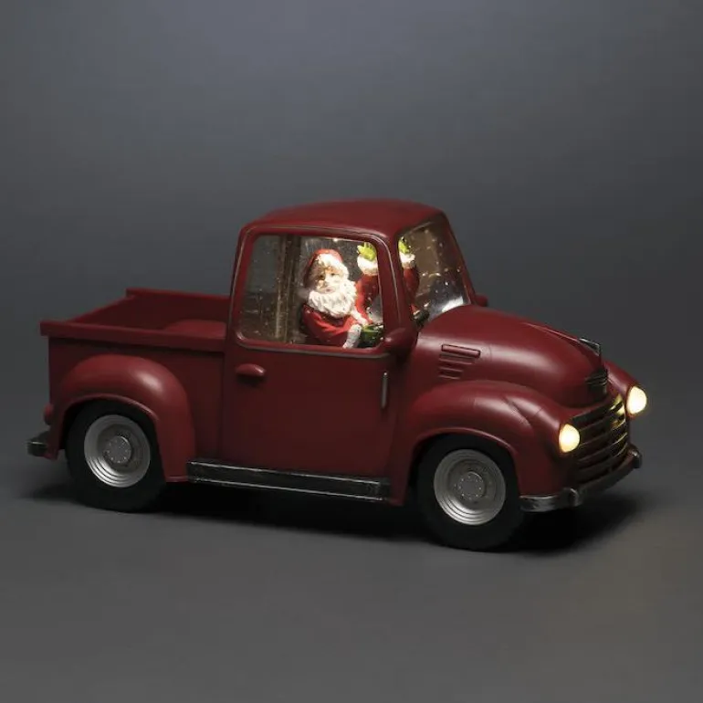 Vesitäytteinen auto, jossa on joulupukki ja koristevalaistus. Valaisimessa on 5h ajastin ja 3 paristoa.