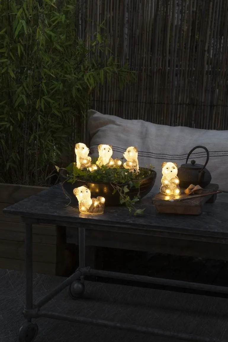 Viisi istuvaa akryylipandaa. Pandojen välinen etäisyys on 1 m ja läpinäkyvä liitäntäkaapeli on 5 m. Koristevalaisin sopii myös ulkokäyttöön.