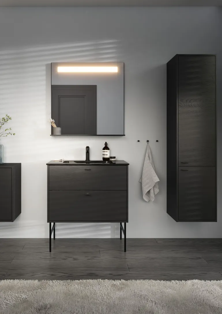 Musta korkea kaappi Gustavsbergiltä, älykäs säilytystila yläovessa. Helppo asentaa ja kiinnittää seinään. Ovet sulkeutuvat pehmeästi ja ne voi kääntää oikealle tai vasemmalle asennusta varten. Kaapissa on yksi kiinteä puuhylly ja neljä siirrettävää lasihyllyä. Valmistettu kosteisiin ympäristöihin tarkoitetusta kylpyhuoneluokan materiaalista.