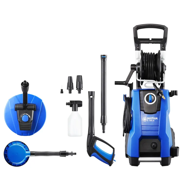 E 145.4-9 PA X-TRA EU useita tärkeitä pitkään kestävää työtä helpottavia ominaisuuksia, kuten teleskooppikahva, vankkatekoiset pyörät, pitkä paineletku, yhdellä kädellä käytettävä letkukela ja hiljaisen käyntiäänen varmistava kumikiinnitys. Suorituskyvyn parantamiseksi tässä Nilfisk-mallissa on Click&Clean-liitäntä erilaisia lisävarusteita varten. PA-malli: Patio-terassinpesulaite ja pyörivä harja vakiovarusteina. X-TRA-mallia on helppo siirtää vaunurakenteen ansiosta.