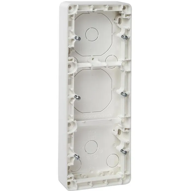 Elko EKO09673 3-lokeroinen korotuskehys mm. upotettavia kytkimiä, yhdistelmäpistorasioita ja heikkovirtalaitteita varten pinta-asennukseen. Voidaan asentaa kojerasiaan olemassa olevan asennuksen laajentamiseksi, kaapelin ulostulon yli tai kaapelilla syöttämiseen sivulta. Valmistettu halogeenittomasta kestomuovista.