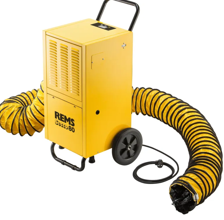 REMS Secco 80 Set on teolliseen käyttöön tarkoitettu sähköinen ilmankuivain. Tilojen kuivaamiseen, kellarien yms. kosteudenpoistoon sekä esim. betonin, muurauksen, laastin ja lattiamassan kuivatukseen. Jäähdytysyksikkö rotaatiomäntäkompressorilla ja lauhduttimen moottorilla 230 V, 50 Hz, 680 W, jossa on automaattinen kuumalla kaasulla toimiva sulatusjärjestelmä jatkuvaa käyttöä varten. Luotettava, hiljainen toiminta. Elektroninen ohjausyksikkö valaistulla 3″:n näytöllä ja muistitoiminnolla. Elektroninen hygrostaatti, käyttötuntilaskuri, tehonkulutusmittari. Ilmansuodatin. Tukeva teräspeltikotelo ja isoilla pyörillä varustettu rullattava teräsputkiteline. Kartonkipakkauksessa.
