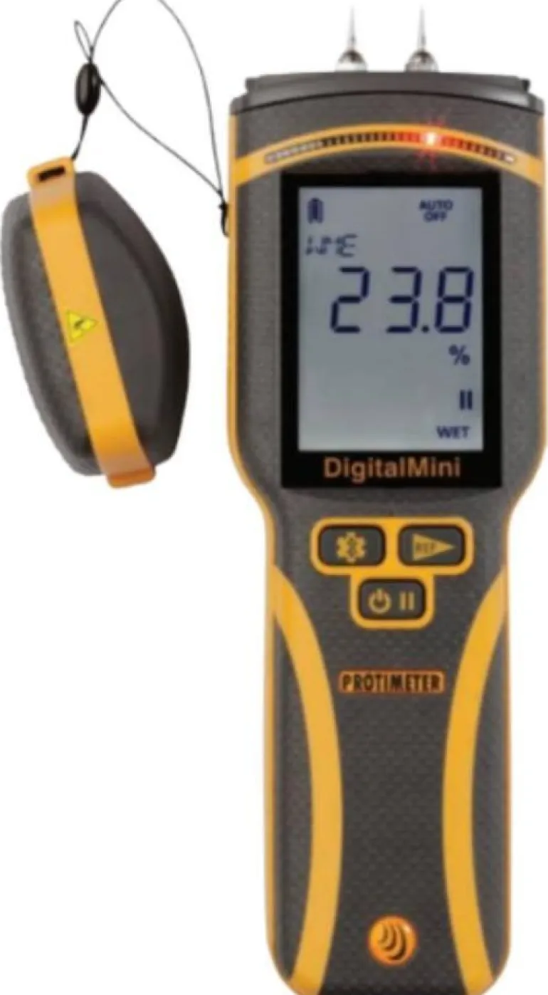 Kestävä, tarkka ja helppokäyttöinen kosteusmittari, joka on varustettu mittauskärjillä, värillisillä LED-ilmaisinvaloilla ja reilun kokoisella digitaalisella näytöllä.