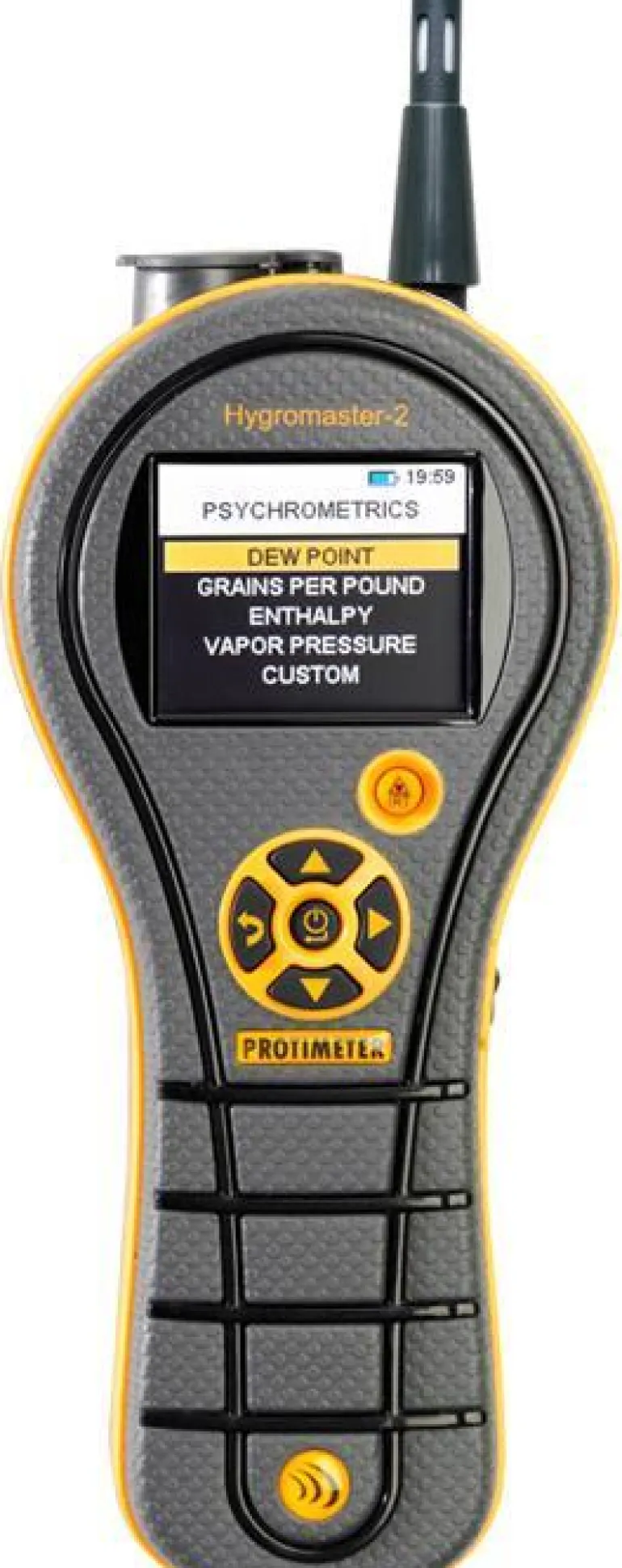 Protimeter HygroMaster II mittaa ilmankosteutta (% RH), ilman lämpötilaa sekä kastepisteitä. Ulkoisella pintalämpötila-anturilla, joka on saatavilla lisävarusteena, voi mitata myös objektien lämpötilaa mahdollisen kastepisteen riskin varalta.