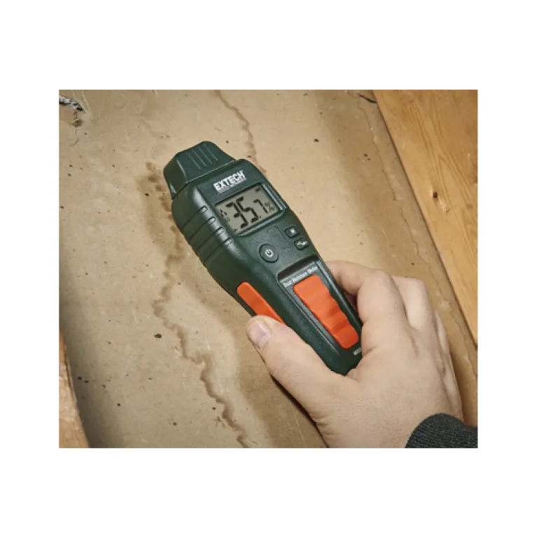 Extech MO55 -kosteusmittari suorittaa nopeat mittaukset puusta ja rakennusmateriaaleista piikillä tai ilman (ei-invasiivinen). Helppokäyttöisen kosteusmittarin näyttökuvakkeet ilmaisevat kosteussisältötasot. Mittarissa on myös hälytysääni. Täydellinen korjausprojekteihin ja sovelluksiin, joissa lattioiden, kaakelien ja mattojen kosteudentunnistus on ratkaisevan tärkeää. Erinomainen työkalu seinien ja kattojen takana olevan vesivuodon jälkivaikutusten analysointiin.