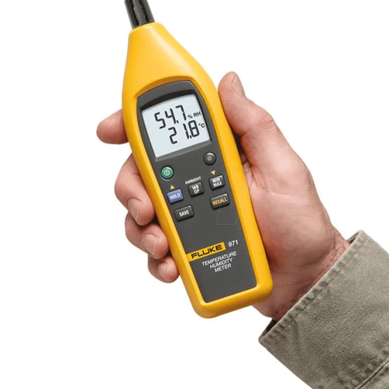 Fluke 971 on kosteusmittari, jolla mittaat nopeasti ilman kosteus- ja lämpöarvot. Lämpötila ja ilmankosteus ovat kaksi tärkeää tekijää, joista laadukas ja hyvä sisäilmanlaatu koostuvat. Fluke 971 on korvaamaton apuväline kiinteistöjen huoltohenkilöstölle, LVI-teknikoille ja sisäilmanlaadun ammattilaisille. Kevyt ja käteen sopiva Fluke 971 on täydellinen työkalu ongelma-alueiden valvontaan.