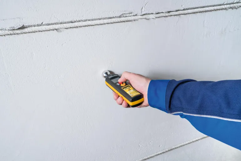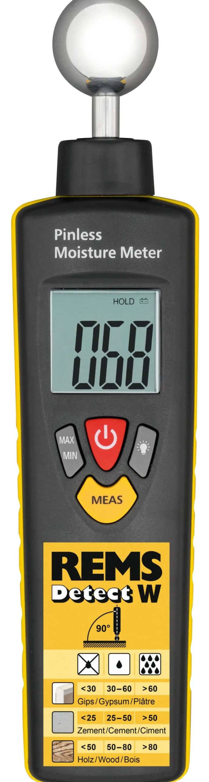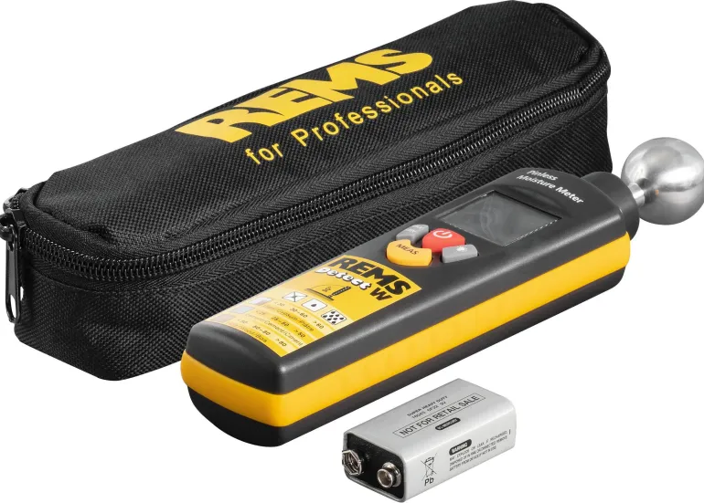 REMS Detect W, dielektrinen kosteusmittari rakennusmateriaalien, esim. betonin, muurauksen, kipsin tai puun, vahingoittamattomaan kosteuden mittaamiseen. Salkussa.