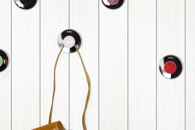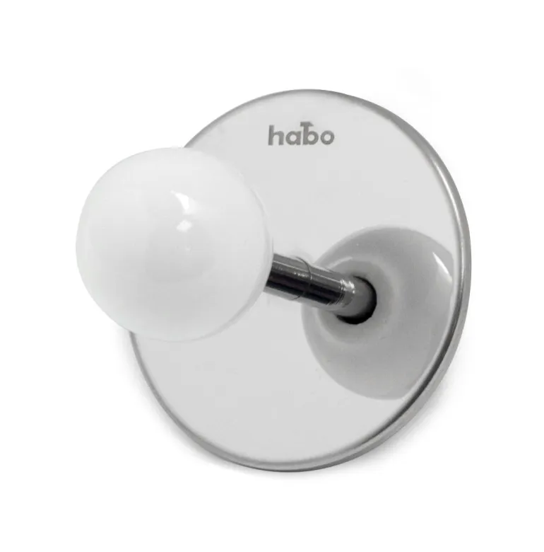 Tarrakiinnitteinen koukku kiillotettua ruostumatonta terästä, posliininuppi. Ulkonema 48 mm. Suositellaan kiinnitettäväksi sileään ja kovaan pintaan kuten kaakeli. Habo ei suosittele koukkua kiinnitettäväksi tapettiin tai vastaavalle pinnalle.