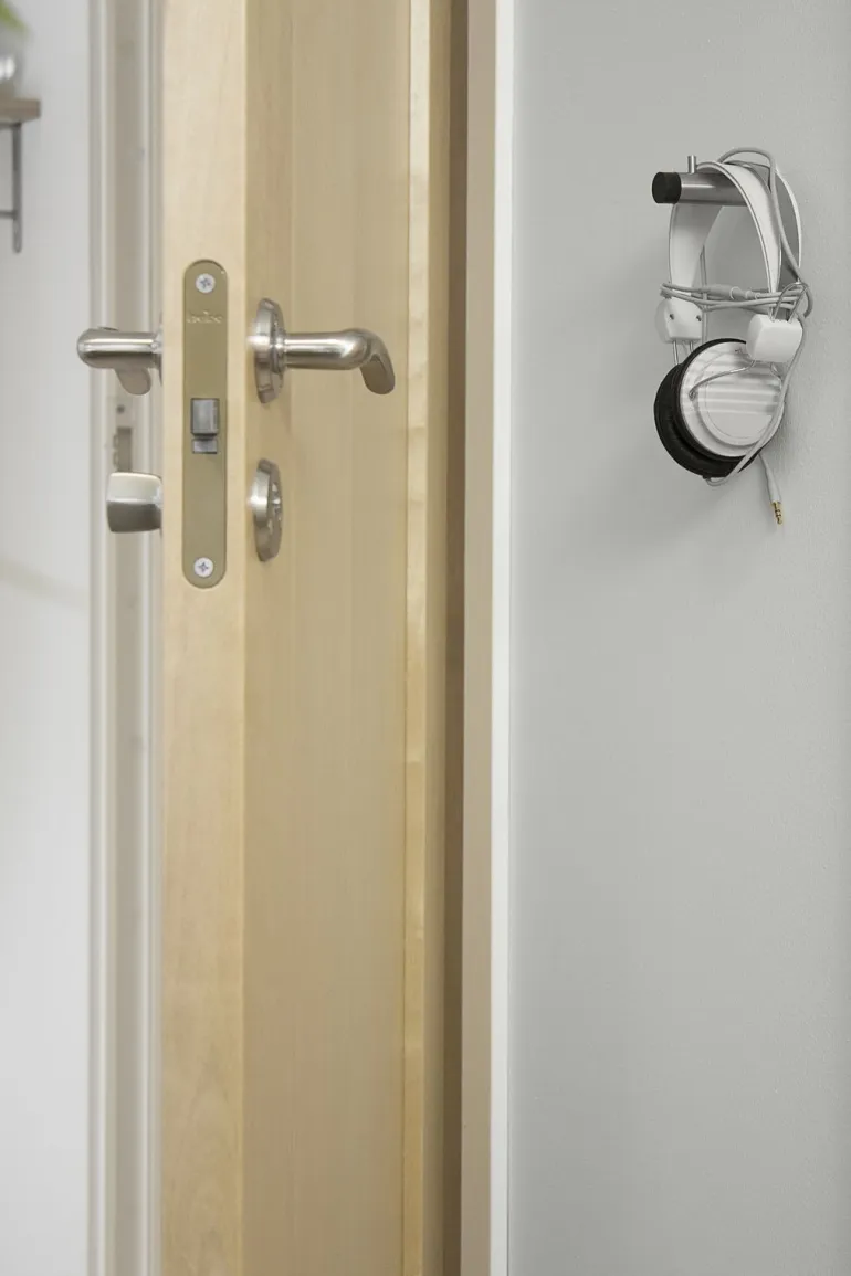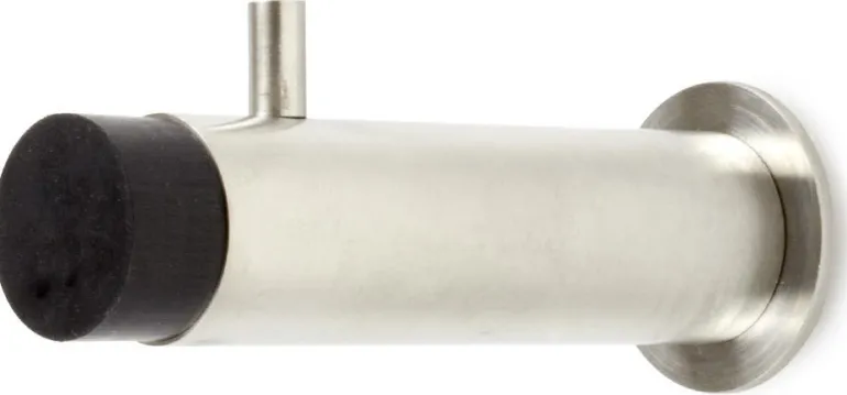 Yhdistetty koukku ja ovenpysäytin harjattua ruostumatonta terästä. Ulkonema 75 mm.
