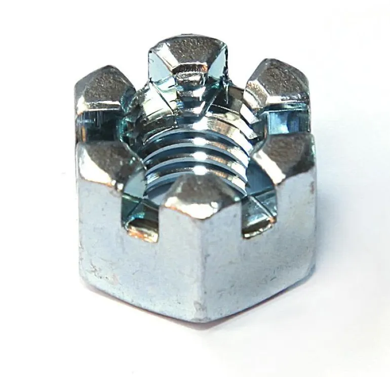 M-kierre. Kruunumutteri DIN 935 -standardin mukainen. Teräsluokka 8.0, kiiltosinkitty.