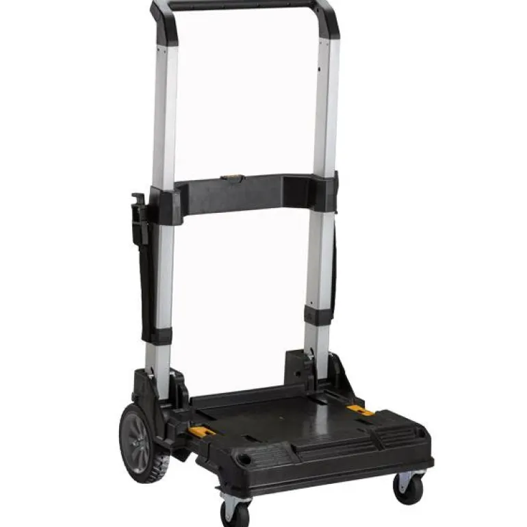 Dewaltin TSTAK-säilytyslaatikoiden kuljetusvaunu helpottaa laukkujen helpompaa käsittelyä. Varustettu vankoilla pyörillä.