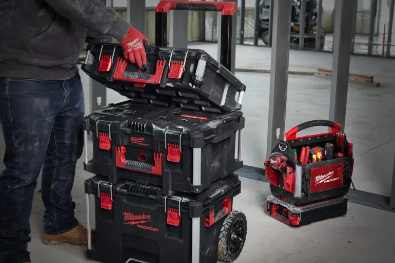 Milwaukee 4932464078 Packout on iskunkestävä kuljetuskärry, jossa on metallivahvikkeet ja maastopyörät. Kuljetuskärryn kapasiteetti on 113 kg.