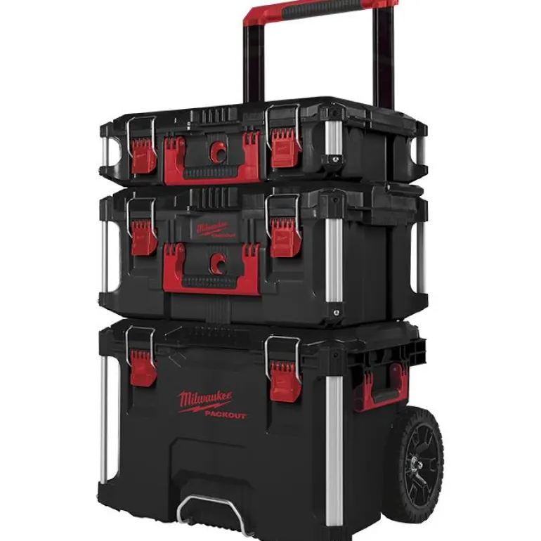 Milwaukee 4932464244 Packout on 3-osainen kuljetuskärry, osa PACKOUT-sarjaa, joka on suunniteltu antamaan käyttäjälle mahdollisuuden vaihtaa ja kiinnittää laajan valikoiman vahvoja työkalulaatikoita, tarvikelaatikoita ja