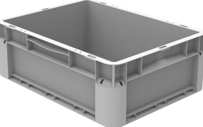 Kevyt kuljetuslaatikko ergonomisilla kahvoilla. Pyöristetyt kulmat antavat lisävahvuutta ja sujuvoittavat käyttöä rullakuljettimissa.