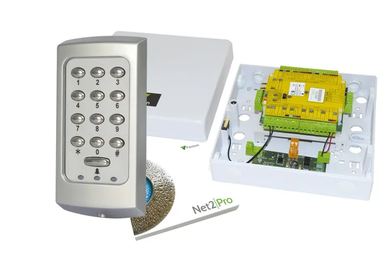 Pakkaus sisältää oven keskusnumeron 5877331, lukijan e-numeron 5870478 ja ohjelmiston (CD ja lisenssiavain) Net2 Pro e-nro 5877335.