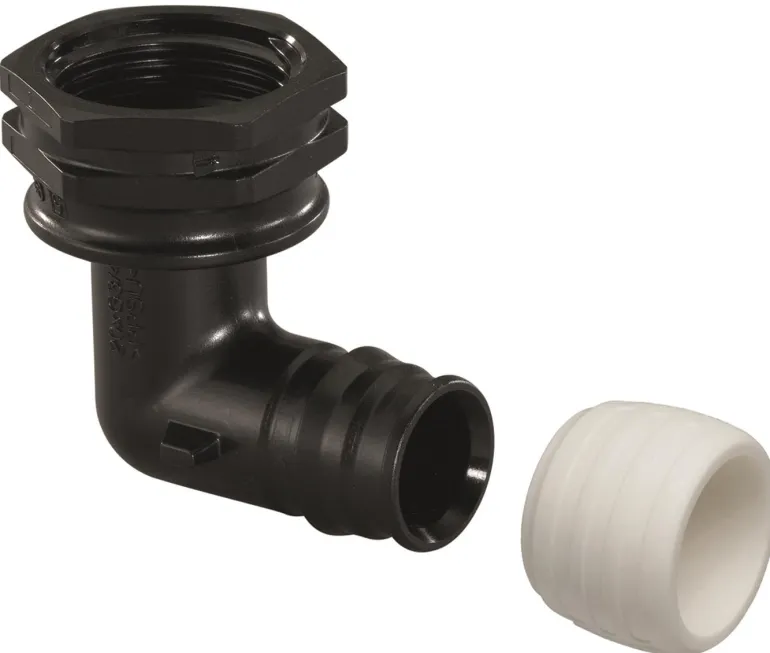 Uponor 1880262 on kulma-adapteri, jossa on liukumutteri ja Q&E-rengas, joita tarvitaan kytkimen liittämiseen Uponor PEX -putkeen.
