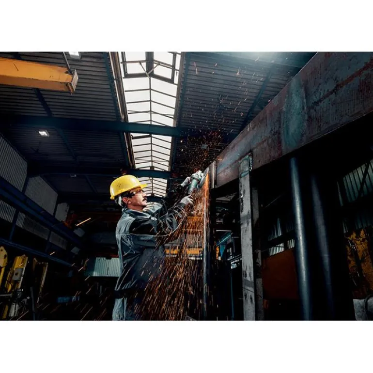 - Tehokas kone, jopa 1900 W, teollisuuden hitsaussaumojen työstämiseen samalla leikkaussyvyydellä kuin isolla kulmahiomakoneella (Ø 230 mm), vaikka paino on vain puolet ison koneen painosta