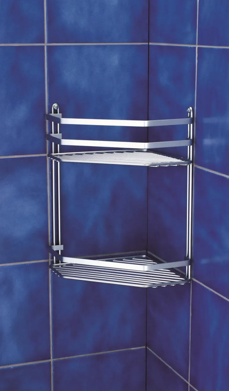 Kromattu kulmahylly kahdella tasolla ruostumattomasta teräksestä. Kiinnitetään seinään.