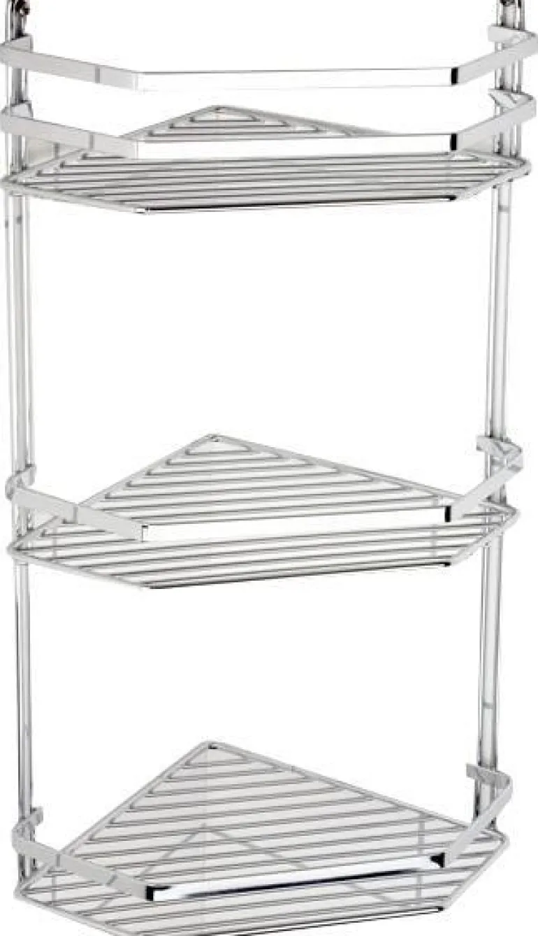 Kulmahylly kolmella hyllyllä, valmistettu kromista. Seinäasennukseen, korkeus 500 mm.