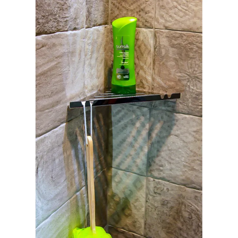 Kulmahylly kylpyhuoneeseen ruostumattomasta teräksestä. Mukana liima asennusta varten sekä puhdistussarja.
