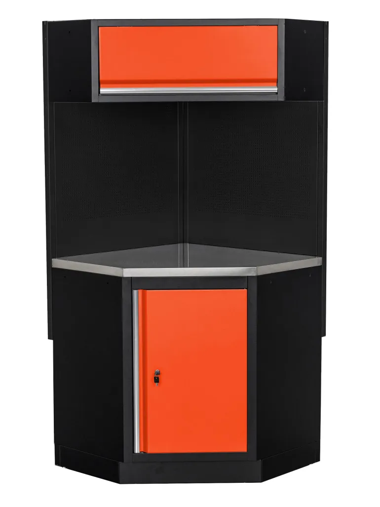 PELA oranssi/musta autotallikalusteen kulmaosa, joka koostuu ala- ja yläkaapista, ruostumattomasta teräksestä valmistetusta työtasosta ja kahdesta työkalutaulusta. Lähin oranssin värikoodi on RAL 2009.