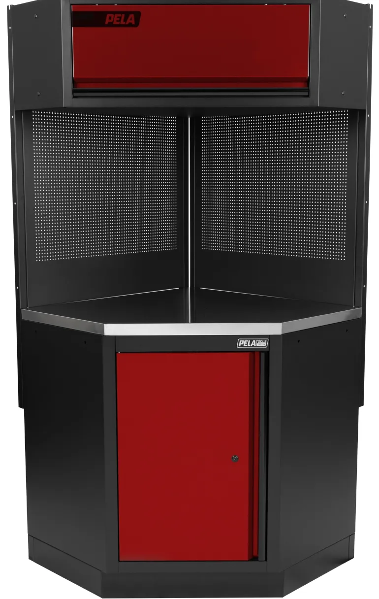PELA 546482 kulmaosa PELA 2.0-työpistekalusteelle 546214. Kulmaosan mitat (PxLxK): 1270x965x2005 mm. Kulmakaapissa ala- ja yläkaapit, ruostumattomasta teräksestä valmistettu työtaso ja kaksi työkalutaulua. Lähin värikoodi: RAL 3001.